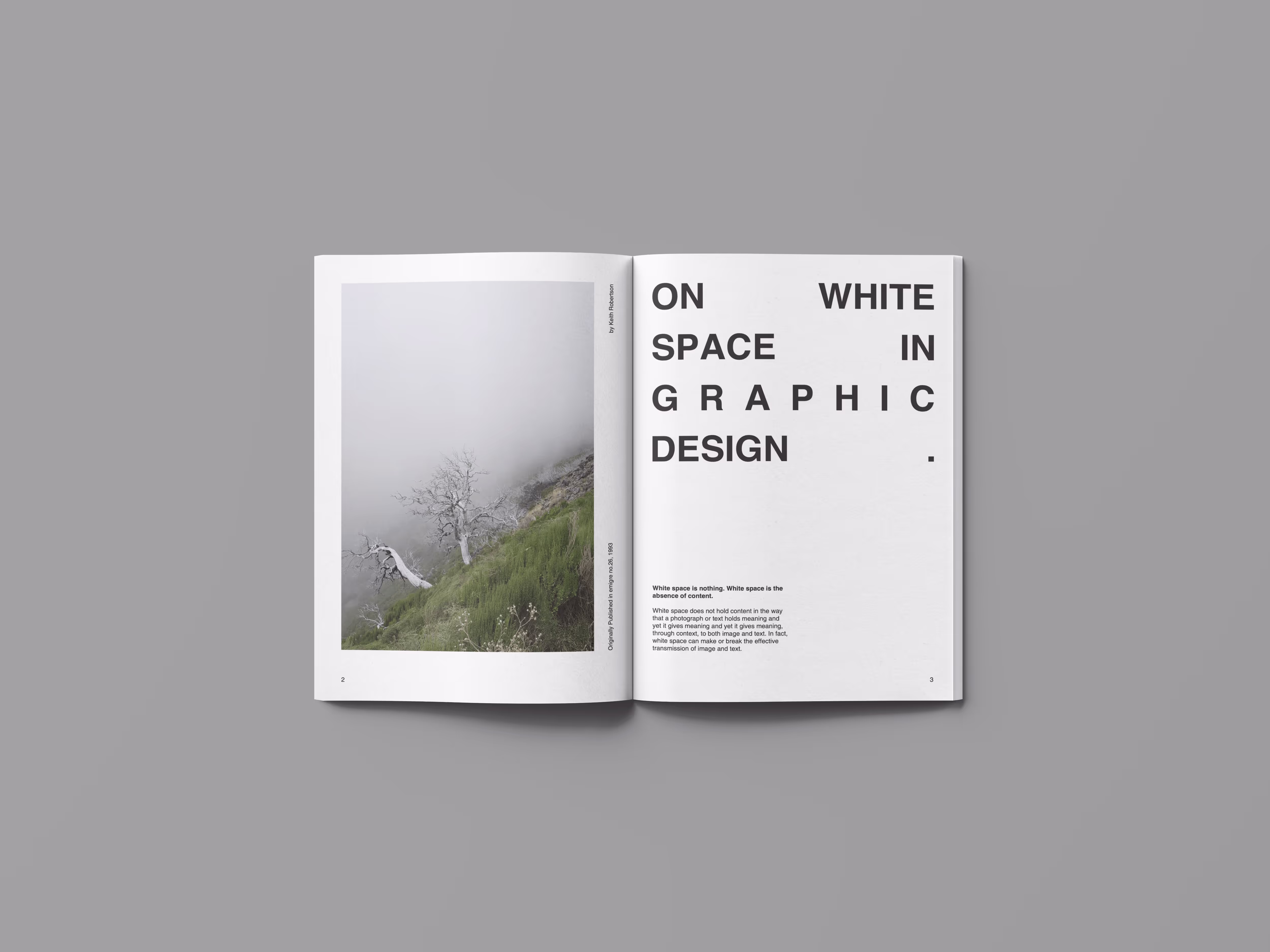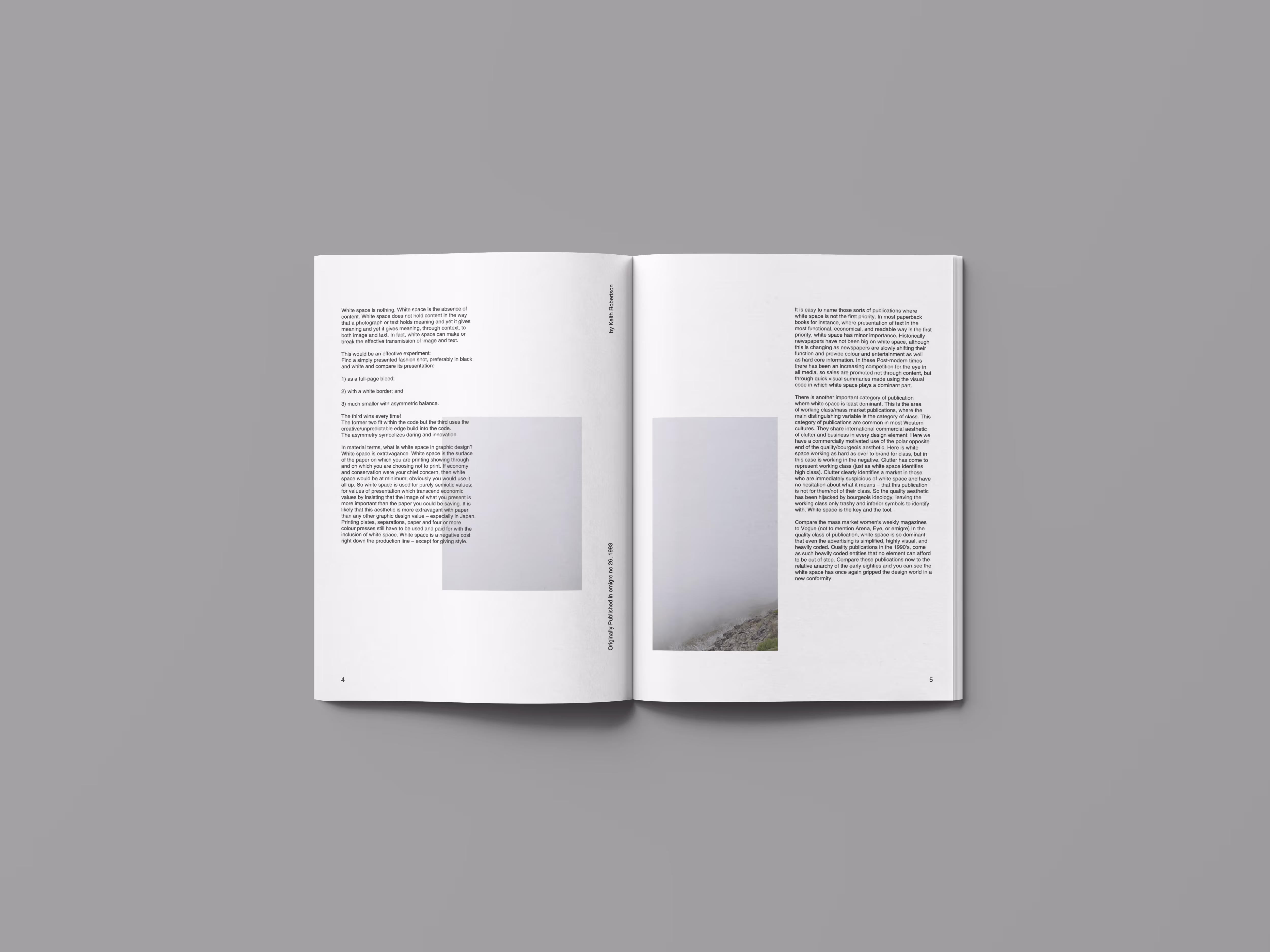 In the world of graphic design, white space is not just an empty area; it is a powerful element that breathes life into the composition, creating balance, focus, and clarity. This project explores the theme of white space through the design of a magazine, emphasizing how the intentional use of space can elevate content and enhance the reader's experience. Each layout is crafted to showcase how white space guides the eye, highlights key elements, and fosters a sense of elegance and simplicity. Much like fog envelops a landscape, white space in design creates an atmosphere where the essential elements can emerge with clarity. Just as fog softens the view, allowing certain details to stand out while others recede, white space in design allows for a visual pause, giving the eye room to rest and the mind space to process. This interplay between presence and absence, fullness and emptiness, is central to the magazine's aesthetic, drawing parallels between the natural world and the art of design. Through this project, I aim to demonstrate that white space is not merely the background but a critical design tool that shapes the visual narrative, much like fog subtly shapes the environment around it.